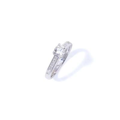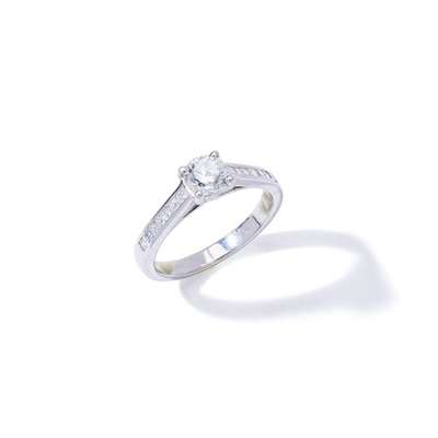 The brilliant-cut diamond, weighing 0.71 carat, in a four-claw 18ct white gold mount, between princess-cut diamond shoulders, UK hallmark