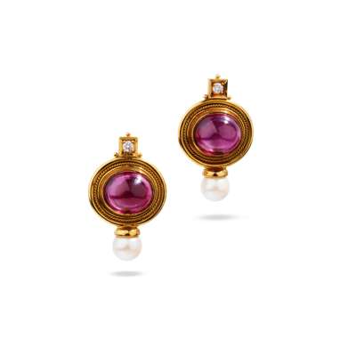 Each oval cabochon pink tourmaline collet-set to an 18ct gold ropetwist frame, with a box-set brilliant-cut diamond above and 7.7mm cultured pearl below, clip fittings, signed Gage, UK hallmark, maker's case