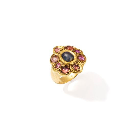 The oval cabochon sapphire collet-set within a pink foiled cabochon gem surround, mounted in 18ct gold, later UK hallmarked