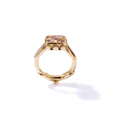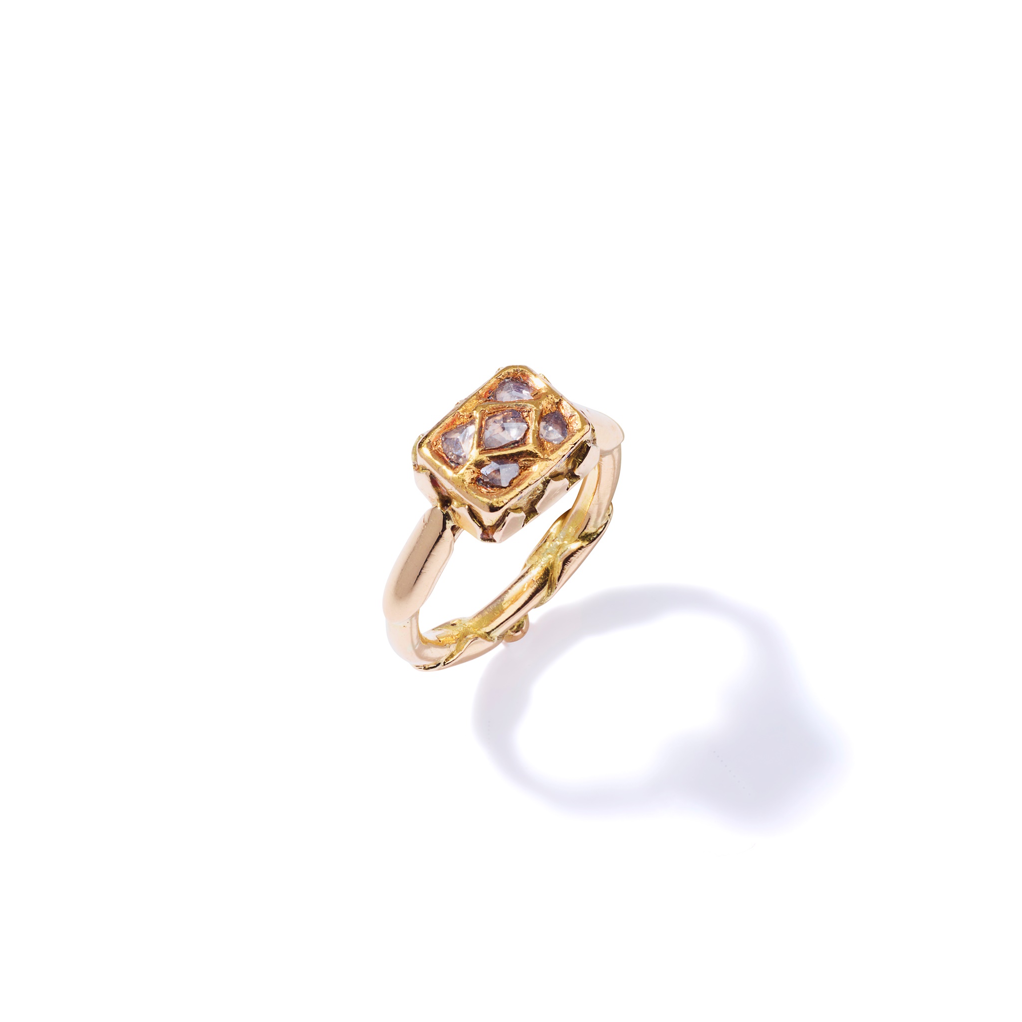 Set with five rose-cut diamonds in foiled closed-back settings, within a rectangular mount with decorated gallery, to a hoop with wrapped decoration