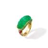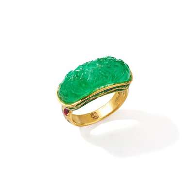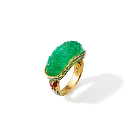 The carved oval cabochon emerald, to a polychrome enamel 18ct gold mount and hoop, UK hallmark