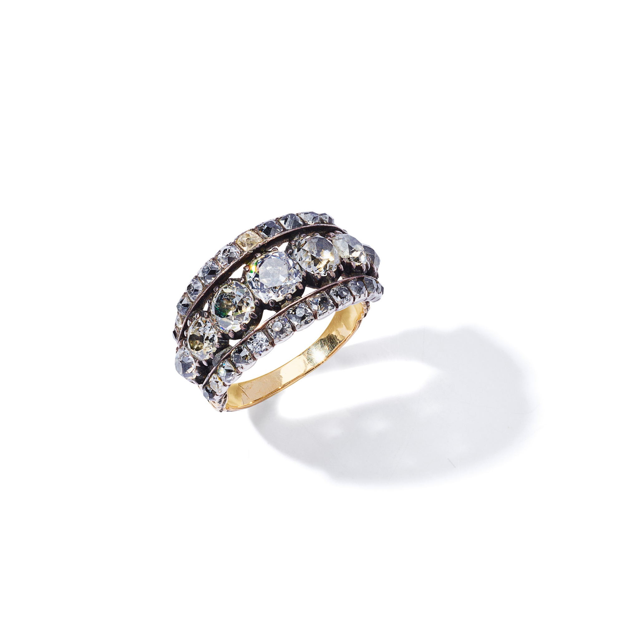 Set with seven graduated old brilliant-cut diamonds, between old mine-cut diamond borders, all in closed back settings, between scrolling shoulders, composite, one small diamond deficient