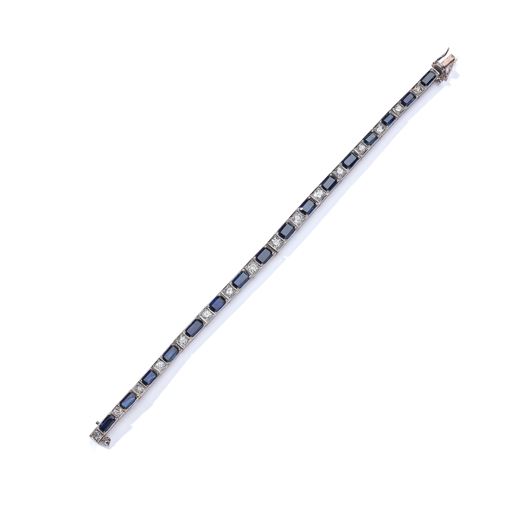Alternately-set with graduated brilliant and old brilliant-cut diamonds and cut-cornered step-cut sapphires, to an engraved gallery