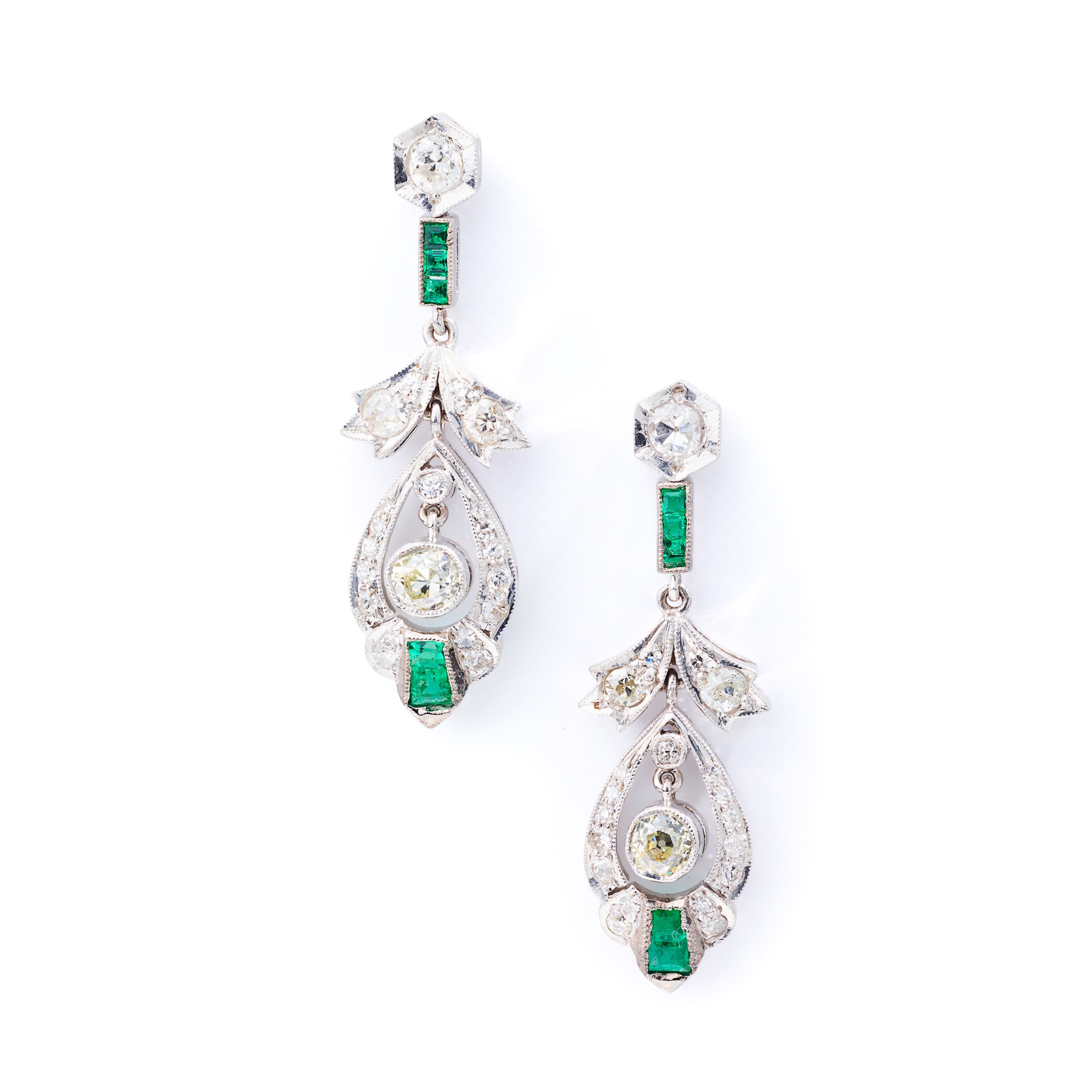 Each openwork drop suspending an old brilliant-cut diamond swing centre, to a foliate and geometric surmount, set throughout with old brilliant and single-cut diamonds and calibré-cut emeralds, post fittings