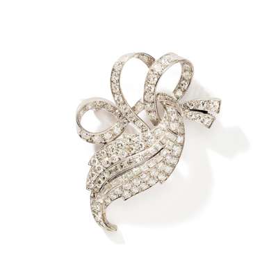 Of scrolling and foliate design, set throughout with old brilliant and square-cut diamonds, later pin fitting