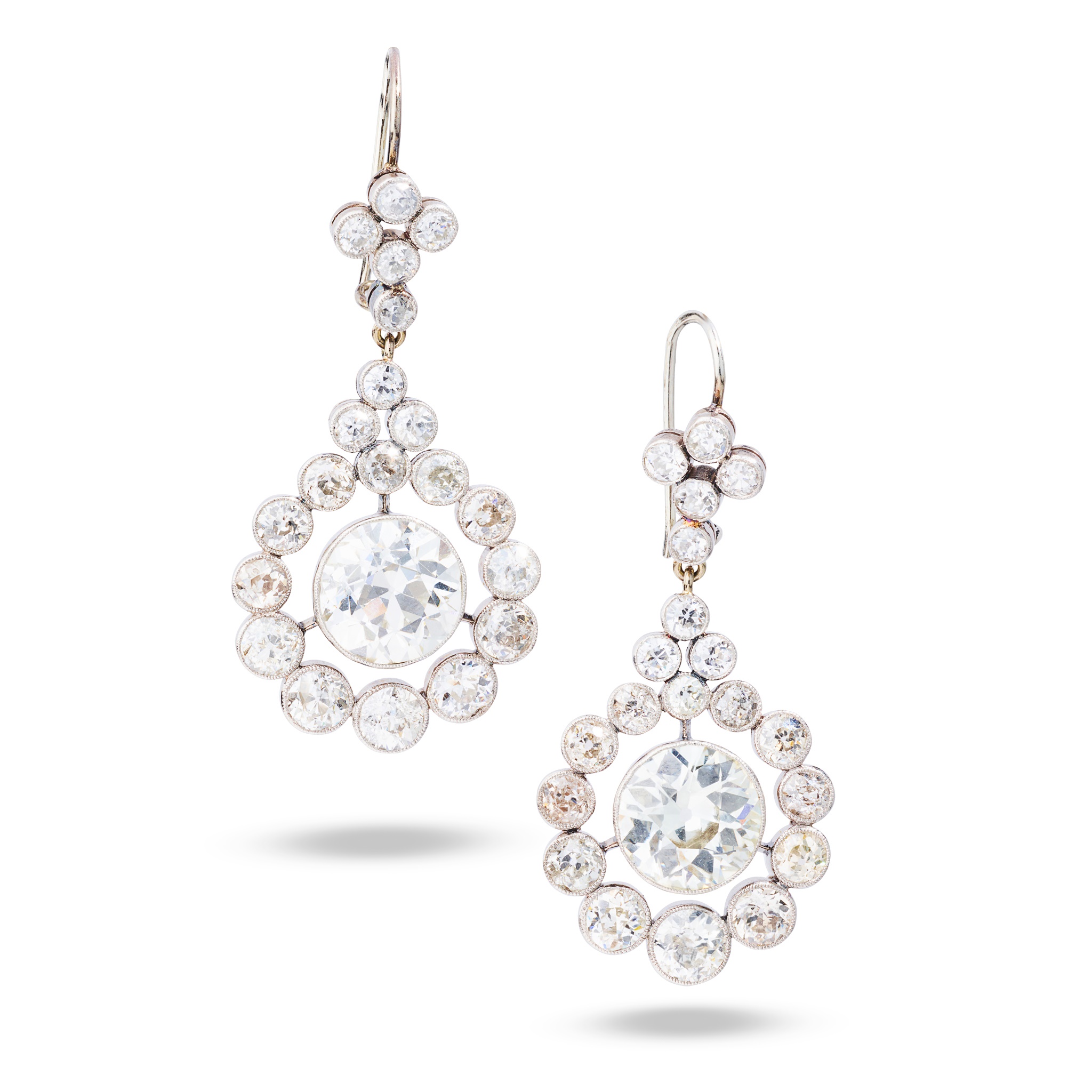 Each millegrain-set old brilliant-cut diamond, within a similarly-set old brilliant-cut diamond circlet surround and cluster surmount, hook fittings