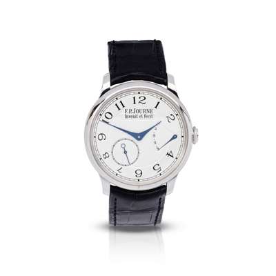 Chronometre Souverain model, No.2-097CS, case with European Convention mark, Swiss and French platinum marks, signed F. P. Journe manual wind calibre 1304 22 jewel movement, signed round silver-coloured dial, Roman numerals in black, sunken small seconds between 7 and 8, sunken fan-shaped power reserve aperture, outer seconds track in black, blued steel tapered hands, skeleton caseback revealing the movement, with FP. JOURNE INV. FECIT. Cronometre Souverain No.2-097CS to the caseback edge, on an F. P. Journe signed black strap with signed clasp, no box and papers, with receipt dated 2013, last serviced 2022