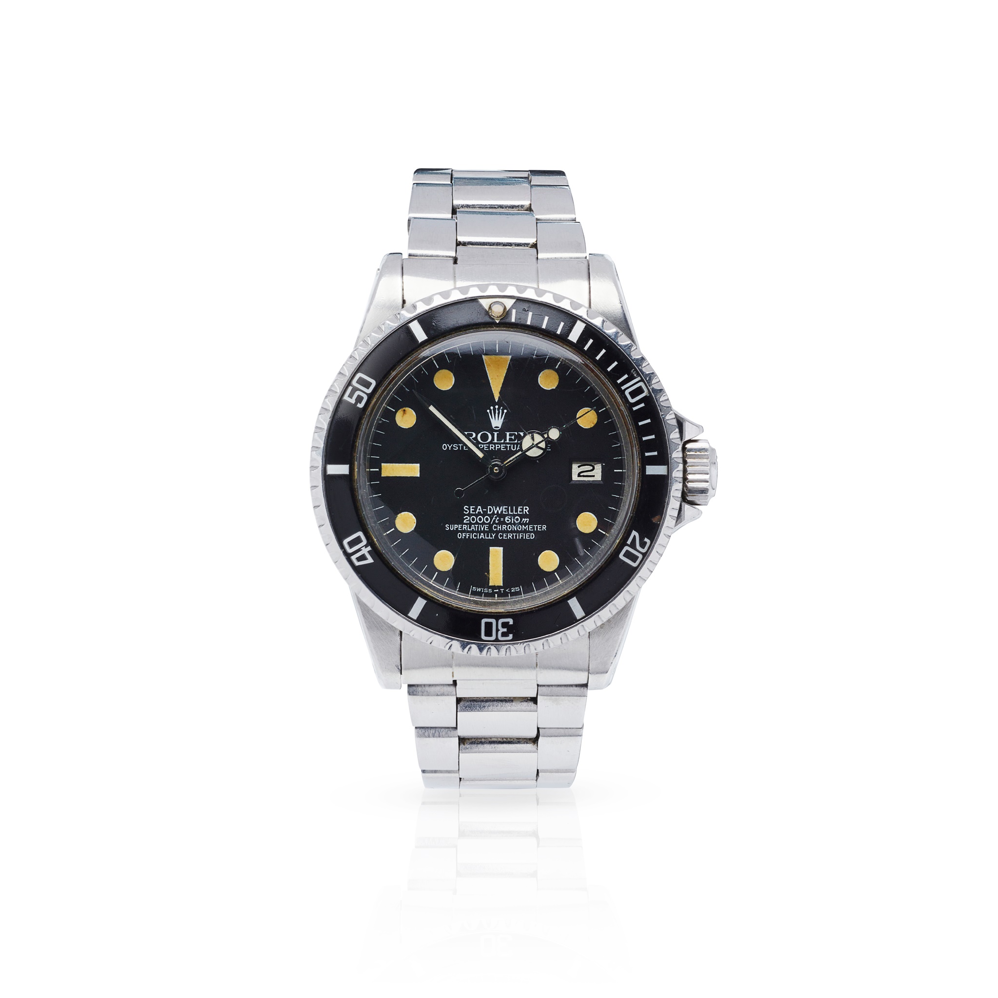 Oyster Perpetual Date Sea-Dweller 'Great White' model 1665, stainless steel case, signed Rolex calibre 1570 automatic movement numbered 0621614, 1979 from serial number, round black dial with lume plots and baton hour markers, date aperture at 3, outer seconds track, lume-filled Mercedes hands, centre seconds hand with lume plot, black bezel with count-up scale, screw-down crown with coronet, on a stainless steel Oyster bracelet strap with 585 to the end link and 93150 to the first link, with a signed Rolex foldover clasp numbered SS6 93150, no box and papers