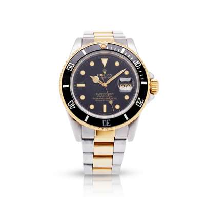 Oyster Perpetual Date Submariner model 16803, stainless steel case, signed Rolex calibre 3035 automatic movement numbered 1107286, 1984 from serial number between lugs, round black dial with gold-bordered lume plots and baton hour markers, date aperture at 3, outer seconds track, lume-filed Mercedes hands, centre seconds hand with lume plot, black bezel with count-up scale, gold screw-down crown with coronet, on a bi-colour stainless steel and gold Oyster bracelet strap with 401B to the end link and 93153 to the first link, with a signed Rolex foldover clasp with 93153 18, no box and papers