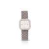 Signed MRG manual wind movement, rounded square dial with applied baton hour markers, sword hands, 18ct white gold case, diamond bezel, on an 18ct white gold integrated woven bracelet strap with foldover clasp, UK hallmark 1976, no box and papers