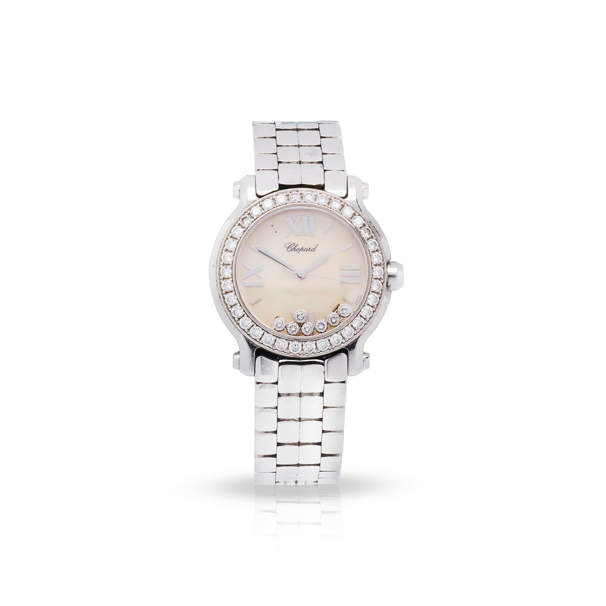 Happy Sport model 278478, stainless steel case, quartz movement, round mother of pearl dial with applied stainless steel Roman numerals, date aperture between 4 and 5, sword hands, centre seconds hand, 'floating' diamonds below the glass, diamond bezel, blue gem-set crown, with model number and 1363216, 8475 to the caseback, on a stainless steel bracelet strap with concealed clasp, in box, with outer box, with booklets, no papers. AMENDMENT 5/10/22 - this does come with papers in the form of a Certificate of Origin dated 2002