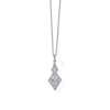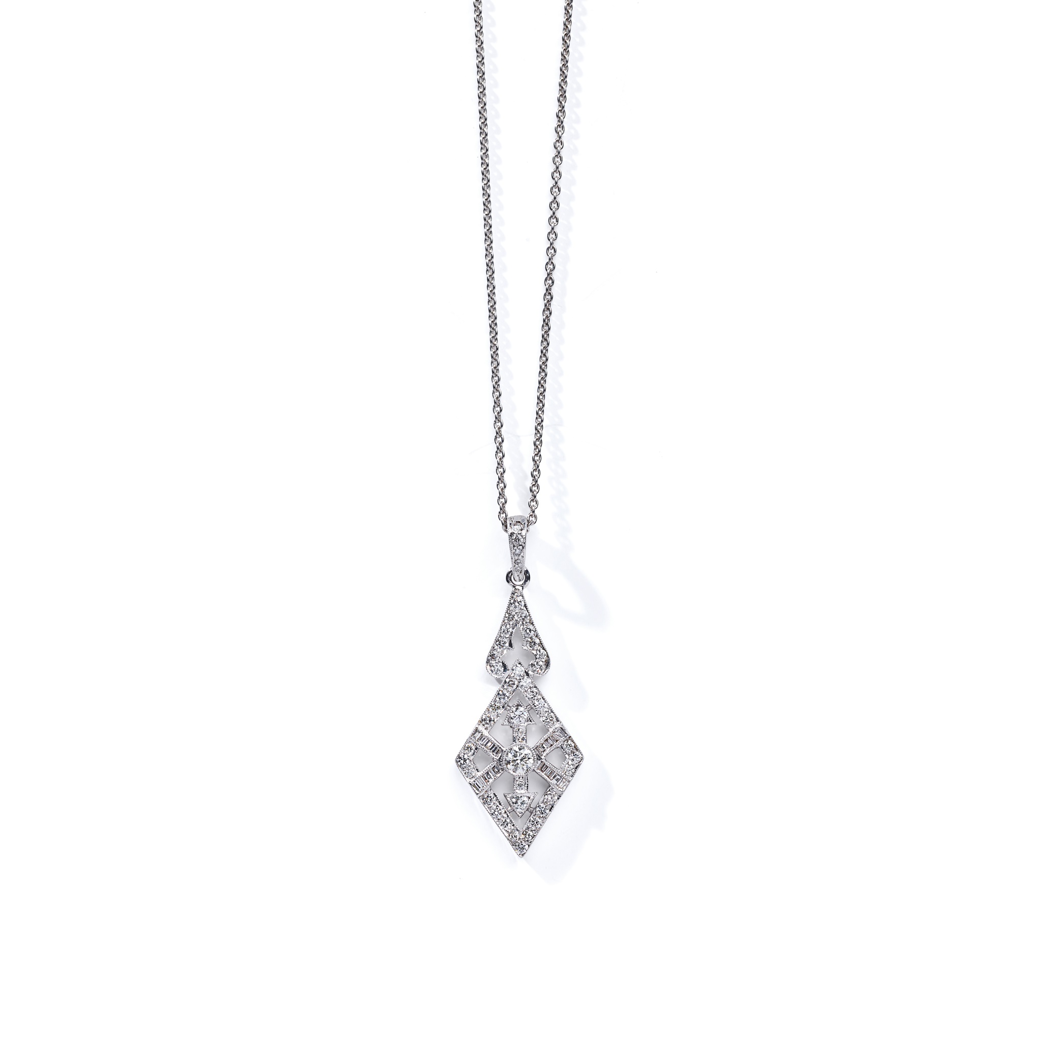 The openwork lozenge-shaped pendant, to an openwork surmount and suspension loop, set throughout with brilliant and baguette-cut diamonds, suspended from a trace-link chain