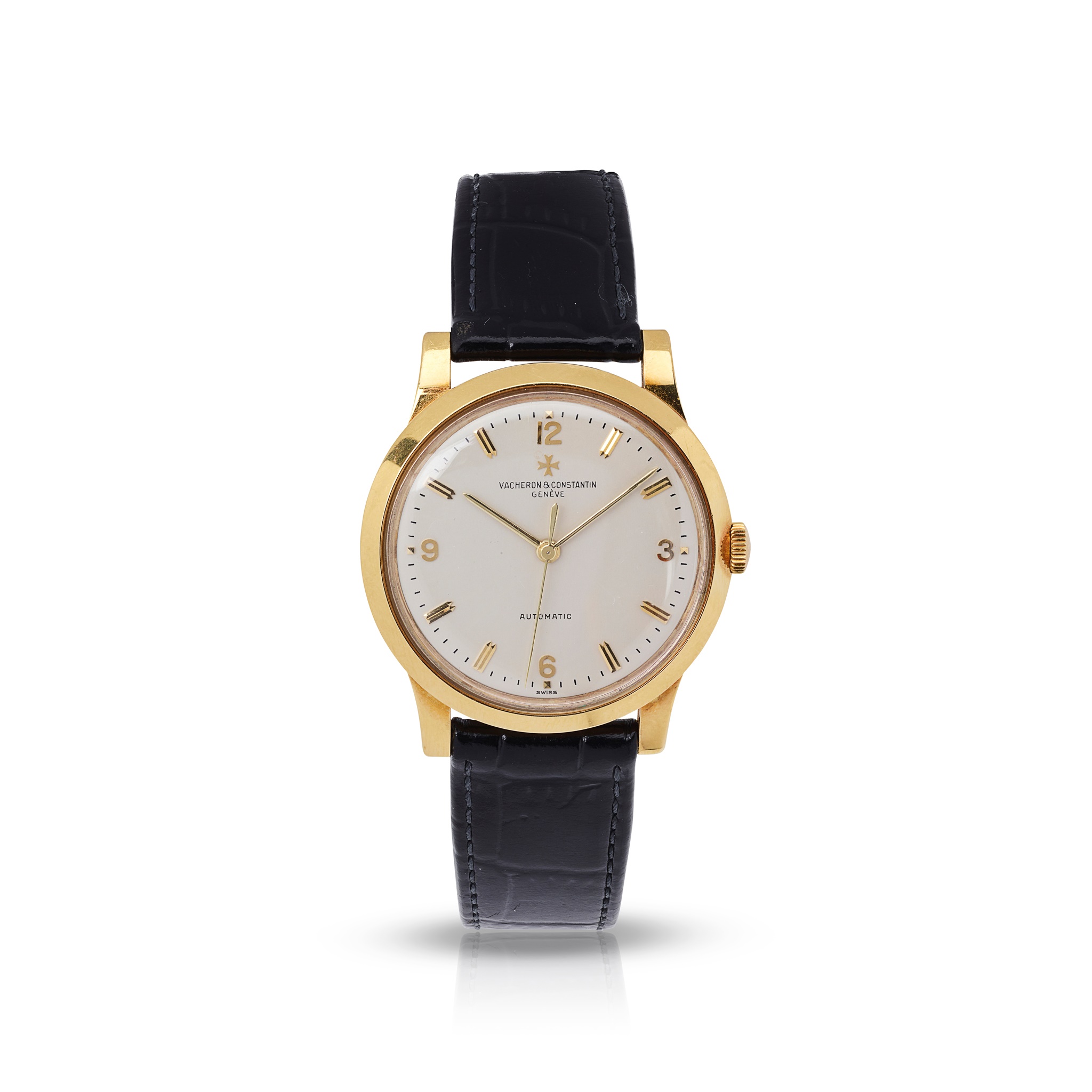 model. 6038, automatic movement, 18ct gold case, round white dial with applied gold 12, 3, 6 and 9 and baton hour markers, outer seconds track in black, gold pencil hands, gold centre seconds hand, Swiss assay mark, on a generic strap, no box and papers