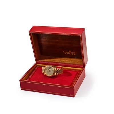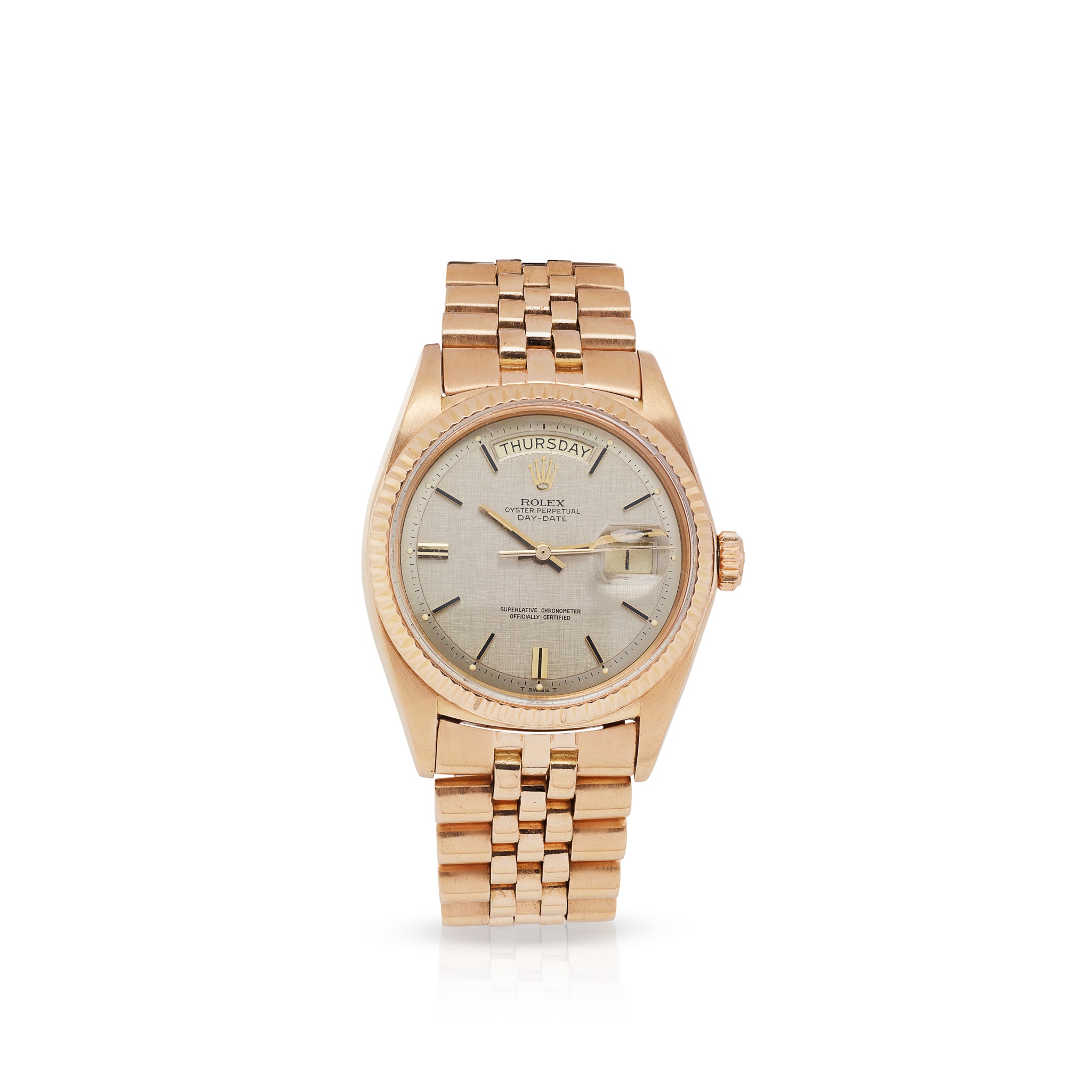 Oyster Perpetual Day-Date model 1803, 18ct rose gold case, signed Rolex calibre 1556 automatic movement numbered DD262554, 1972 from serial number between lugs and on papers, round gold-coloured linen dial with applied baton hour markers, day aperture at 12, date aperture at 3, outer seconds track, gold pencil hands with lume inserts, centre seconds hand, gold fluted bezel, on an 18ct rose gold Jubilee bracelet strap with signed Rolex foldover clasp, Swiss assay marks, in box, with papers and swing tag