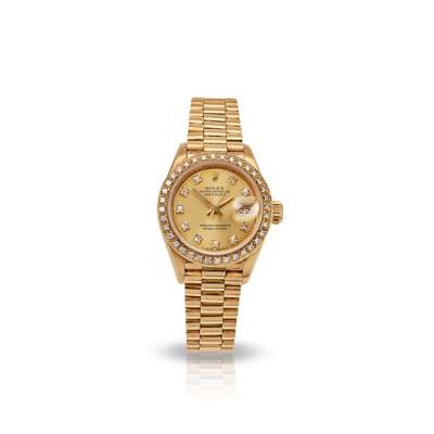 Oyster Perpetual Datejust model 69178, 18ct gold case, signed Rolex calibre 2135 automatic movement, 1993 from serial number between lugs, round gold dial with applied diamond dot hour markers, date aperture at 3, outer seconds track, diamond bezel, screw-down crown with coronet, on an 18ct gold President bracelet strap with signed Rolex clasp marked 8570, Swiss assay and European Convention marks, with box and papers