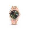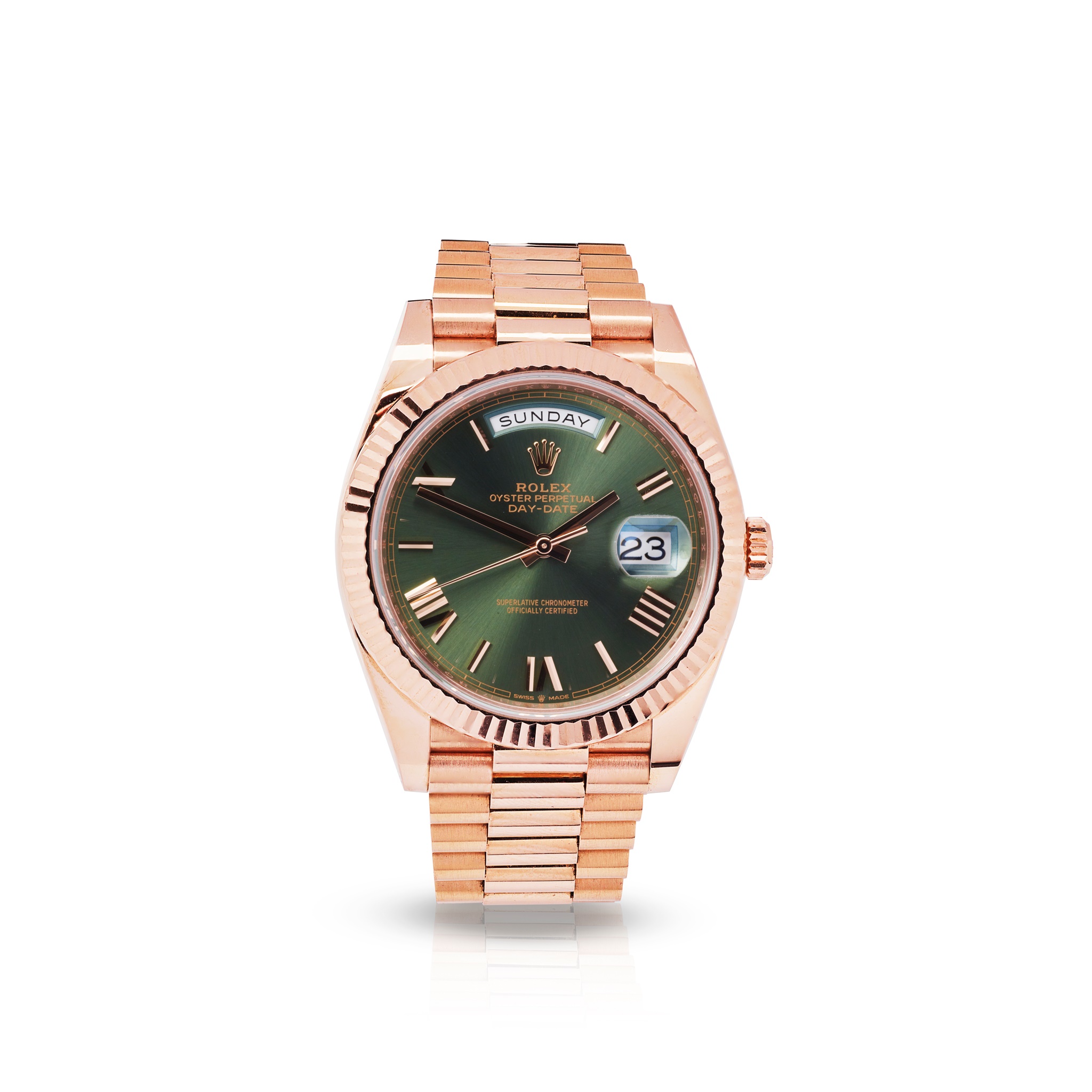 Oyster Perpetual Day-Date model 228235 from between lugs and on guarantee card, 18ct rose gold case, automatic movement, 2011-22 from serial number, round dark green dial with applied rose-coloured Roman numerals, day aperture at 12, date aperture at 3, rose-coloured fluted crown, screw-down crown with coronet, on an 18ct rose gold President bracelet strap with 3EL 83415 and coronet to the interior of the end link, to the signed clasp, with Swiss assay and European Convention marks, with additional links, in box, with outer box, with guarantee card and booklet
