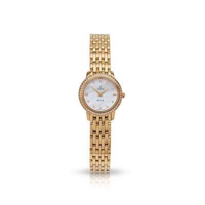 De Ville model, 18ct gold case, signed Omega 1376 quartz movement, signed round mother-of-pearl dial with applied Roman 12, 3, 6 and 9 and diamond dot hour markers, gold sword hands, diamond bezel, with OMEGA and Omega logo to the caseback, on an 18ct gold bracelet strap, with additional links, with a foldover clasp with Omega logo, with European Convention and Swiss assay mark, no box and papers