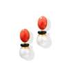 Each collet-set oval cabochon coral, suspending a 13.6mm cultured pearl with an onyx rondelle connector, mounted in 18ct gold, UK hallmark