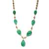 The pear-shaped carved jadeite jade plaque in a wire frame, suspended from a an anchor-link chain set with six graduated carved jadeite jade plaques