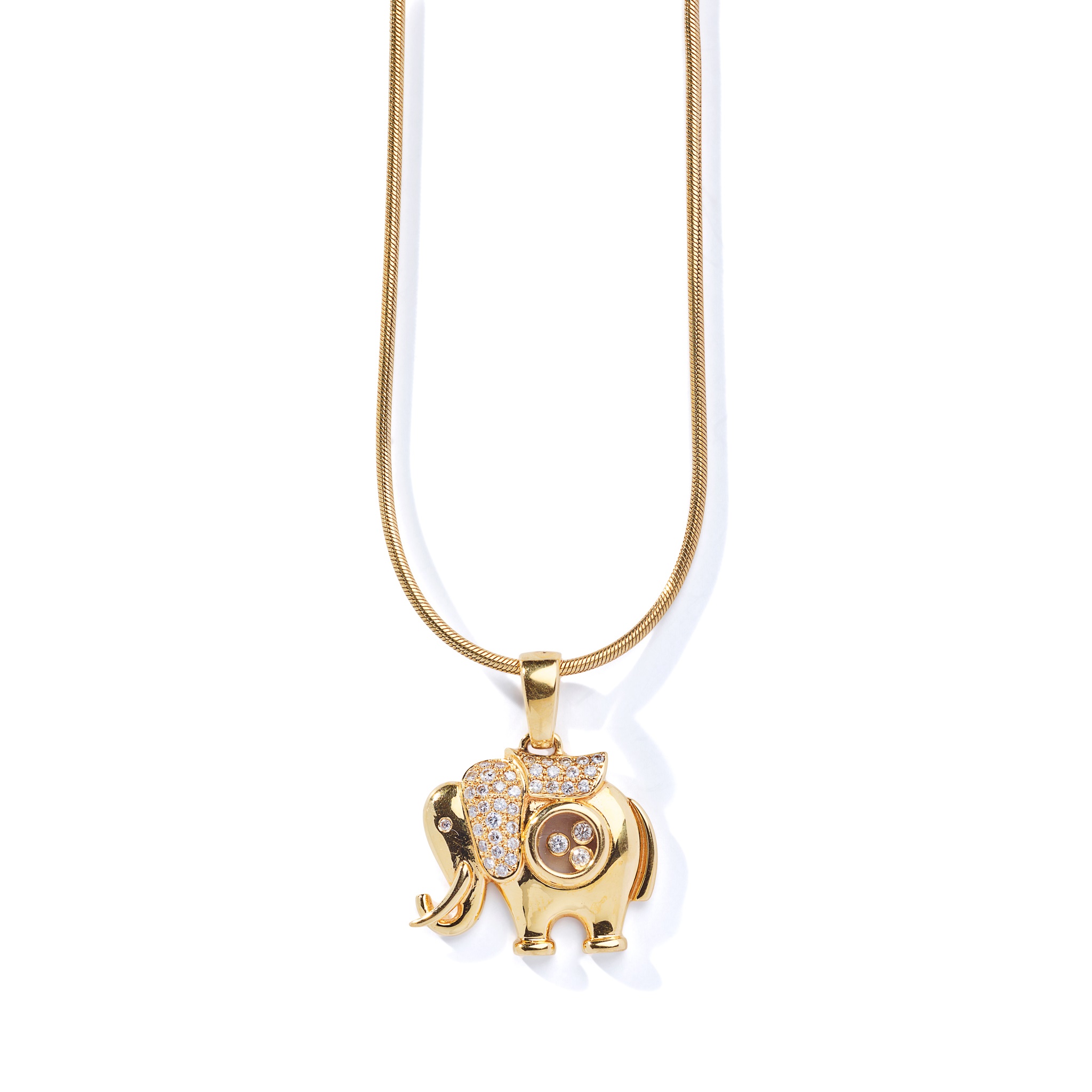modelled as an elephant with pavé-set round brilliant-cut diamond ear and saddle, set with a glazed compartment containing three collet-set round brilliant-cut diamonds, to a snake-link chain
