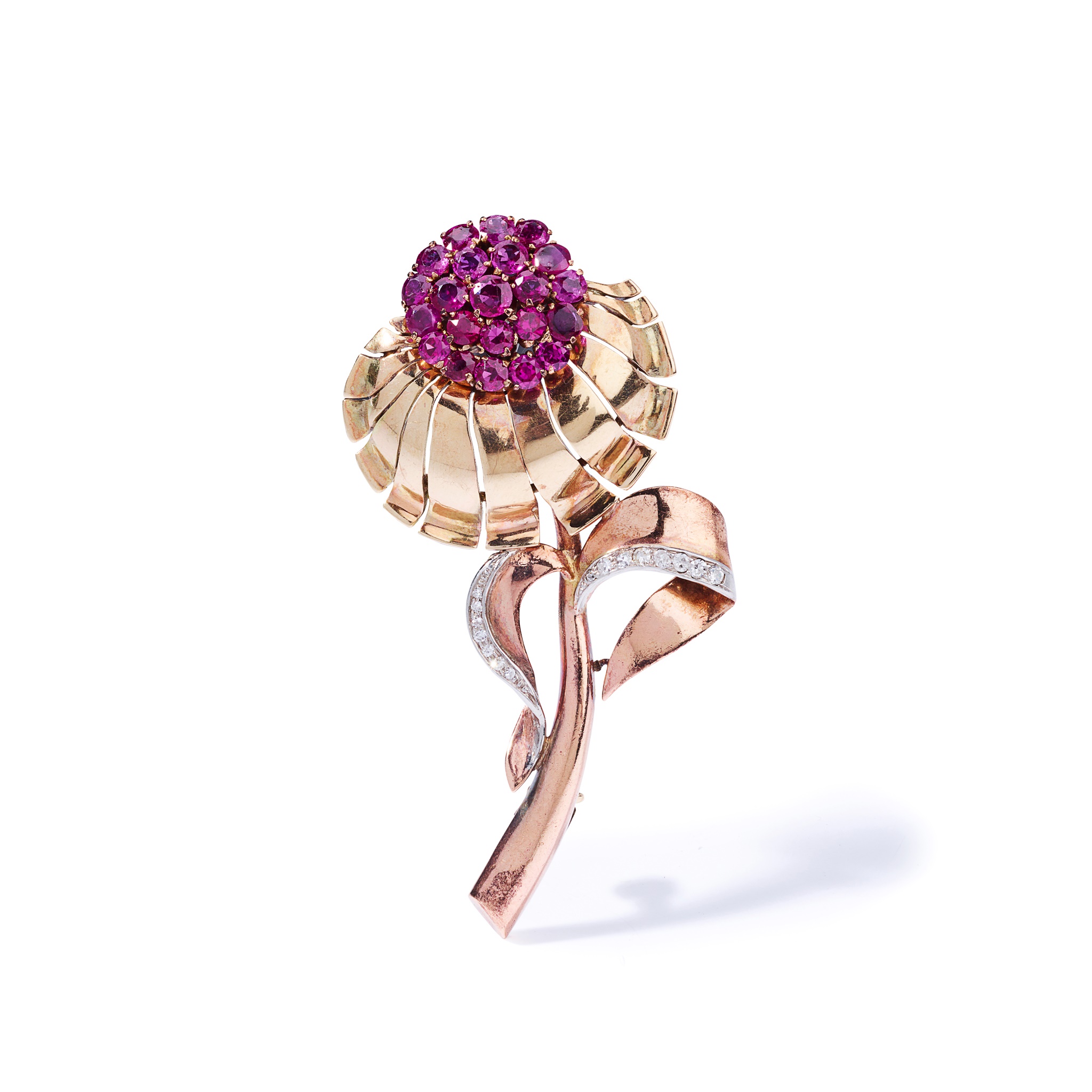 Modelled as a stylised flower, the stamen composed of a cluster of circular-cut rubies, the leaves edged with single-cut diamonds