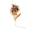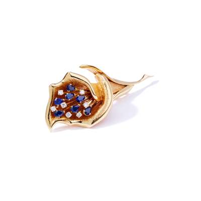 Modelled as a flower, with pear-shaped sapphire and brilliant-cut diamond stamen, within a polished and textured 18ct gold petal surround, French export marks and UK import marks