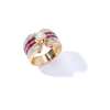 the brilliant-cut diamond between curved shoulders set with twin rows of calibré-cut rubies and brilliant-cut diamonds, with cabochon ruby accents, stamped 14k 585