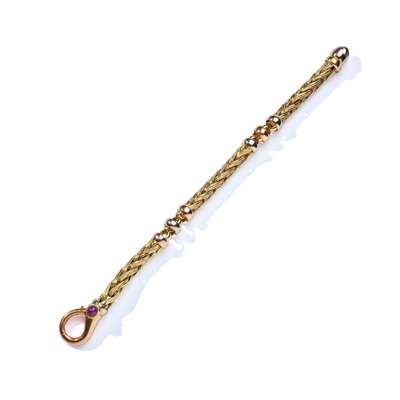 Composed of tri-coloured palmier and fancy links, to a clasp collet-set with a cabochon ruby, signed Fraccari