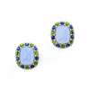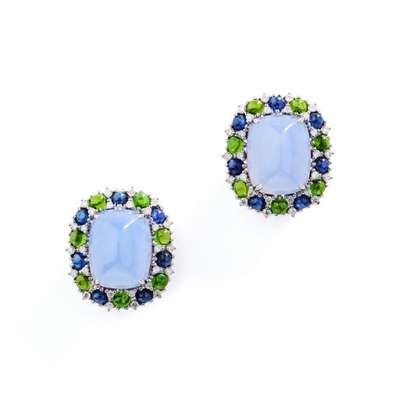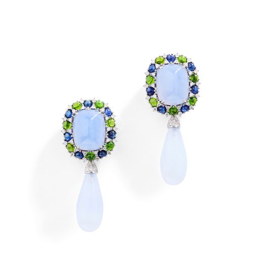Each sugar loaf cabochon chalcedony, within a cabochon sapphire and peridot surround with brilliant-cut diamond accents, suspending a detachable chalcedony drop with diamond-set cap, post fittings