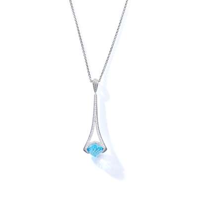 suspending a fancy-cut blue topaz, to a bifurcated surmount pavé-set with brilliant-cut diamonds and circular-cut sapphires, to a belcher link chain, maker's mark RHR