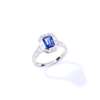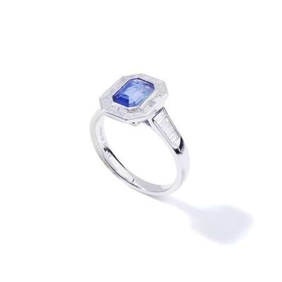 Collet-set with a cut-cornered rectangular step-cut sapphire, within a baguette-cut diamond surround and shoulders
