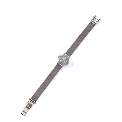 The bombé centre set with brilliant and single-cut diamonds, opening to reveal a circular dial with baton hour markers, between baguette-cut diamond lugs, to a mesh-link bracelet, dial and movement signed Ebel
