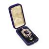 The cut-cornered rectangular-cut amethyst within a rose-cut diamond frame, to a foliate scrolling and scalloped surround set with rose-cut diamonds and 4.7-5.8m pearls, to a similarly-set drop and surmount, mounted in silver and gold, detachable brooch and pendant fittings, pearls untested, fitted case