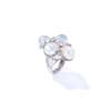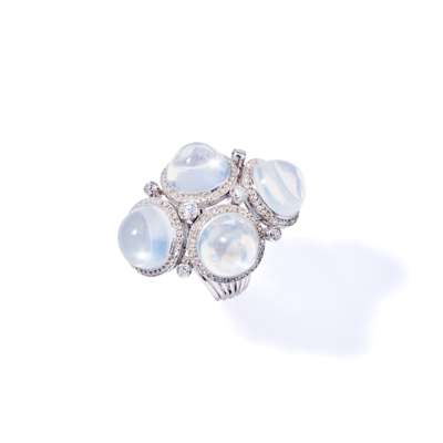 Designed as four circular cabochon moonstones in rose-cut diamond surrounds with single and brilliant-cut diamond accents, raised above a wirework hoop