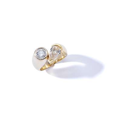 Collet-set with a brilliant-cut and a pear-shaped diamond to a bi-colour mount