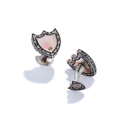 Each designed as a silver 'Dom Perignon' label with central mother-of-pearl panel accented with a single brilliant-cut diamond, the edges inscribed 'vintage', the bar connector engraved DP, to shield-shaped terminals, UK hallmark silver 2003, maker's mark, numbered 24/97, maker's pouch