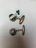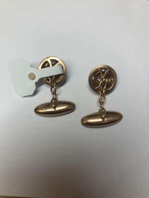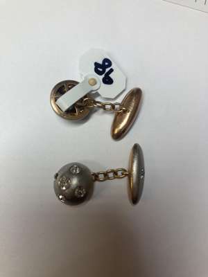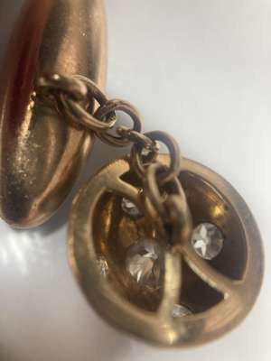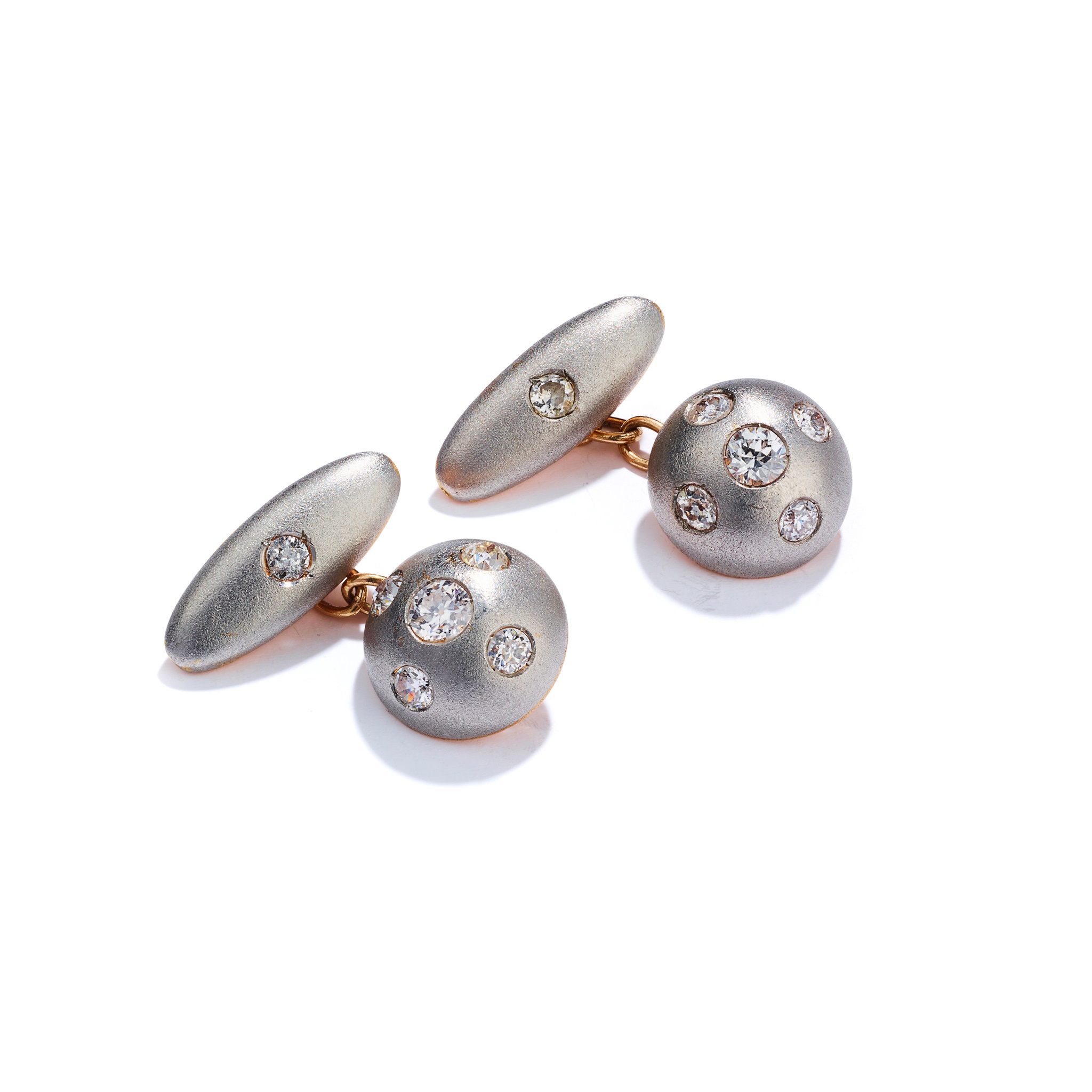 Each of bi-coloured brushed bombé design, inset with five old brilliant-cut diamonds, to a similarly-set torpedo-shaped terminal, chain connectors