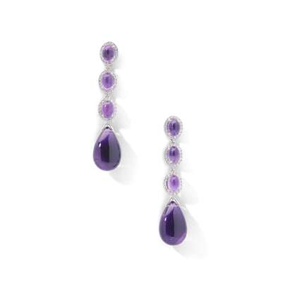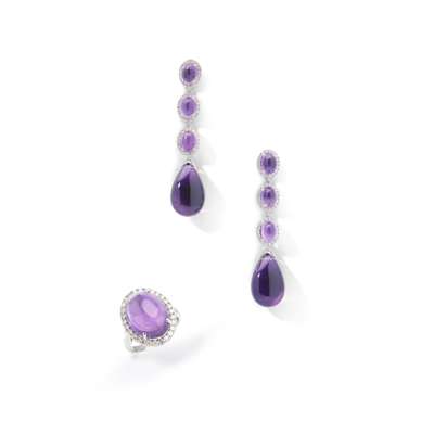 The oval cabochon amethyst within a brilliant-cut diamond surround; together with a pair of earrings, composed of three similarly-set amethyst and diamond clusters suspending an amethyst drop, mounted in 18ct white gold, UK hallmarks