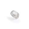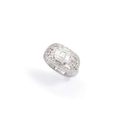 Set with a cluster of vari-shaped step-cut diamonds, within a brilliant and tapered baguette-cut diamond openwork surround