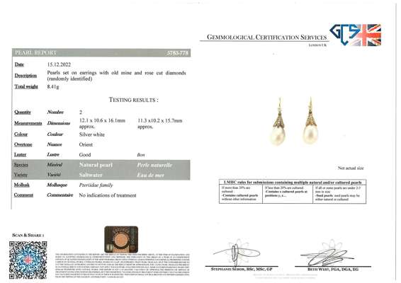 Accompanied by GCS report stating that the pearls measuring approx. 12.1x10.6x16.1mm and 11.3x10.2x15.7mm, are natural, of saltwater origin. Report no. 5783-778, dated 15th December 2022.