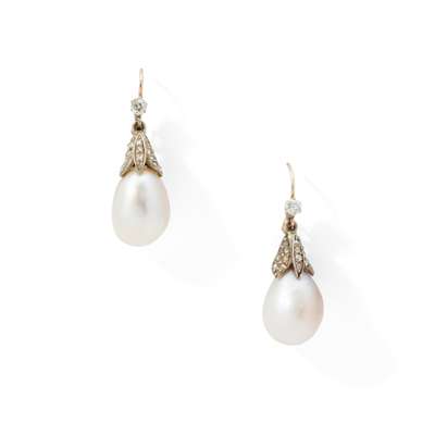 A pair of natural pearl and diamond earrings