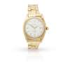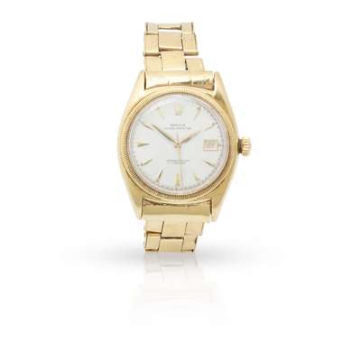 model 6105, c.1952 from serial number, 18ct gold case, signed Rolex automatic Perpetual movement, round white dial with applied gold coronet at 12 and wedge and arrowhead hour markers, date aperture at 3 with date in red, outer seconds track in black, gold bevelled sword hands with lume inserts, gold centre seconds hand, coin edge bezel, screw-down crown with coronet, caseback with monogram, on a tapered expanding 18ct gold Oyster bracelet strap, centre links with 18 and crown as partial UK hallmark for 18ct gold, RD874089 to the endlink, signed Rolex foldover clasp marked WABCY & Co. and with full UK hallmarks for 18ct gold, no box and papers