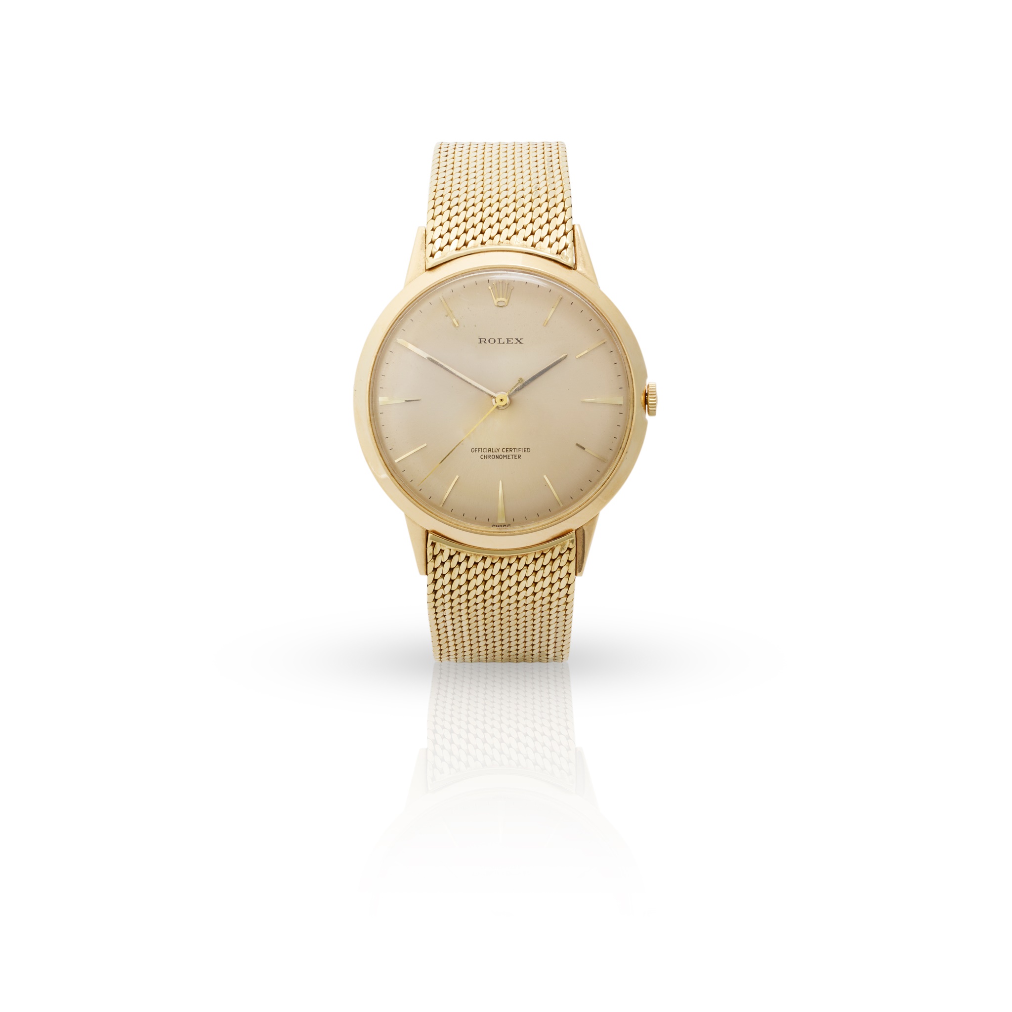 model 8940, 1960s, 18ct gold case, signed Rolex manual wind movement, round champagne dial with applied baton hour markers, coronet at 12, gold pencil hands, centre seconds hand, crown with coronet, on a matched mesh bracelet strap with Omega foldover clasp marked 750, no box and papers