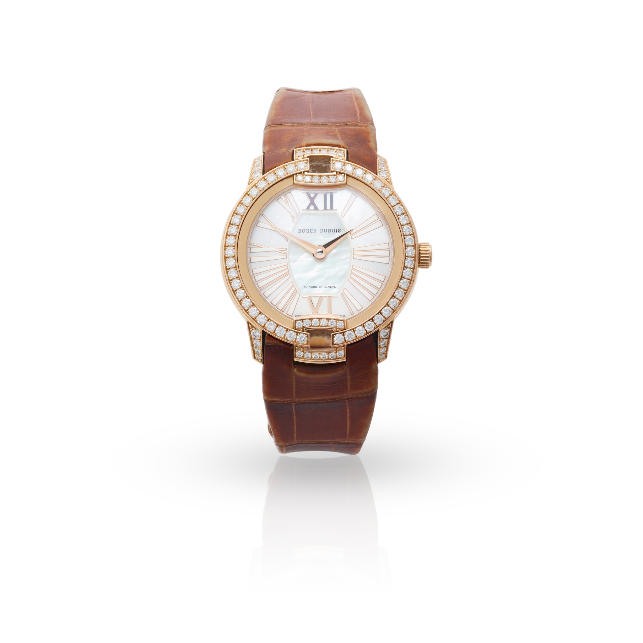 Velvet model 86780, the case marked AU 750 to the lug, signed Roger Dubuis RD821 automatic movement, round mother of pearl dial with rose-coloured Roman 12 and 6 and rose-edged white Roman numerals, bevelled rose-coloured sword hands, crown with RD logo, exhibition caseback, with model and serial numbers to the edge, on a signed Roger Dubuis brown crocodile strap numbered B VE36STD with a signed Roger Dubuis 18ct rose gold clasp with European convention mark, no box and papers