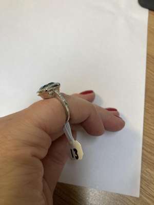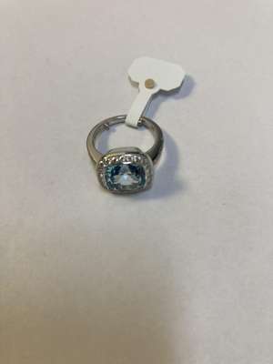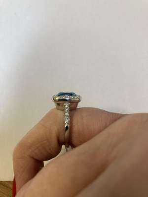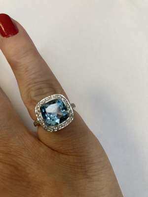 The cushion-shaped blue topaz within a brilliant-cut diamond surround and shoulders, mounted in 18ct white gold, signed Boodles, numbered, maker's mark, UK hallmark, maker's case