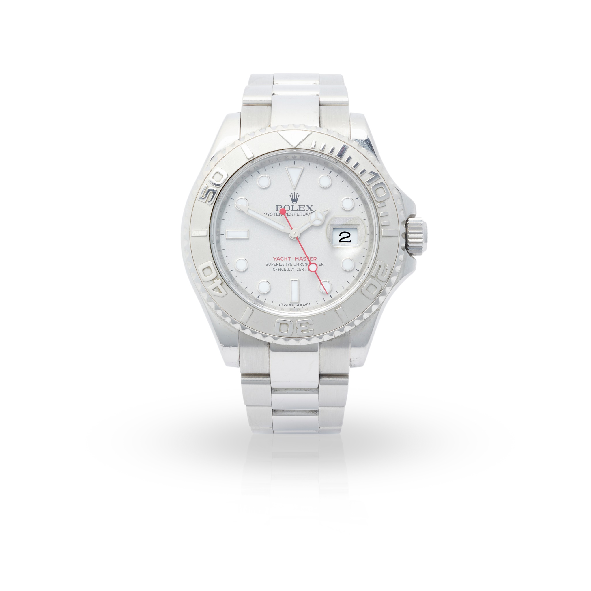Oyster Perpetual Date Yacht-Master model 16622, 2011-22 from serial number to rehaut, stainless steel case, signed Rolex Perpetual calibre 3135 movement, round silver-coloured dial with stainless steel-edged lume plots and markers, date aperture at 3, outer seconds track, lume-filled Mercedes hands, centre seconds hand with lume plot, platinum bezel, screw-down crown with coronet, on a signed stainless steel Oyster bracelet strap with Oysterlock safety clasp marked RS1278760, no box and papers