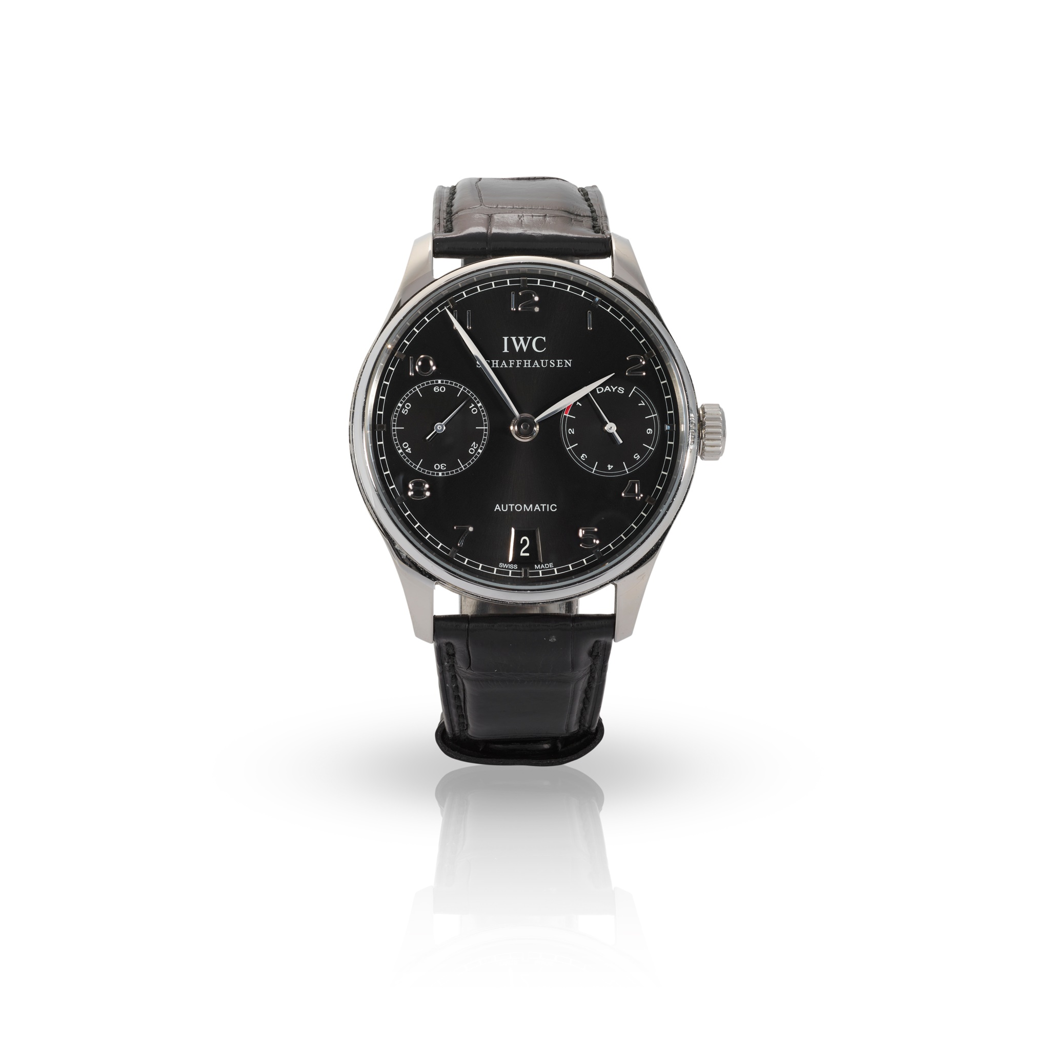 Portuguese Automatic model 5001, stainless steel case, signed IWC calibre C.51011 automatic movement, round black dial with applied stainless steel Arabic numerals, subsidiary dials at 3 and 9 for power reserve and small seconds respectively, outer seconds track in white, stainless steel hands, signed crown, exhibition caseback with serial number to the edge, on a black strap, possibly crocodile, with IWC RAF50221 to the interior, with a signed foldover clasp, in box, with booklets, no papers or warranty card