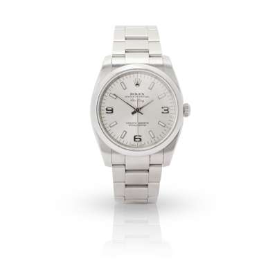 Oyster Perpetual Air-King model 114200 from papers and between lugs, 2011-22 from guarantee card, stainless steel case, automatic movement, round silver-coloured dial with coronet at 12, Arabic 3, 6 and 9, stainless steel-edged white baton hour markers, stainless steel hands with lume inserts, centre seconds hand, outer seconds track, screw-down crown with coronet, on a stainless steel Oyster bracelet strap with signed Rolex foldover clasp marked 07L, in box, with outer box, with warranty card and booklets