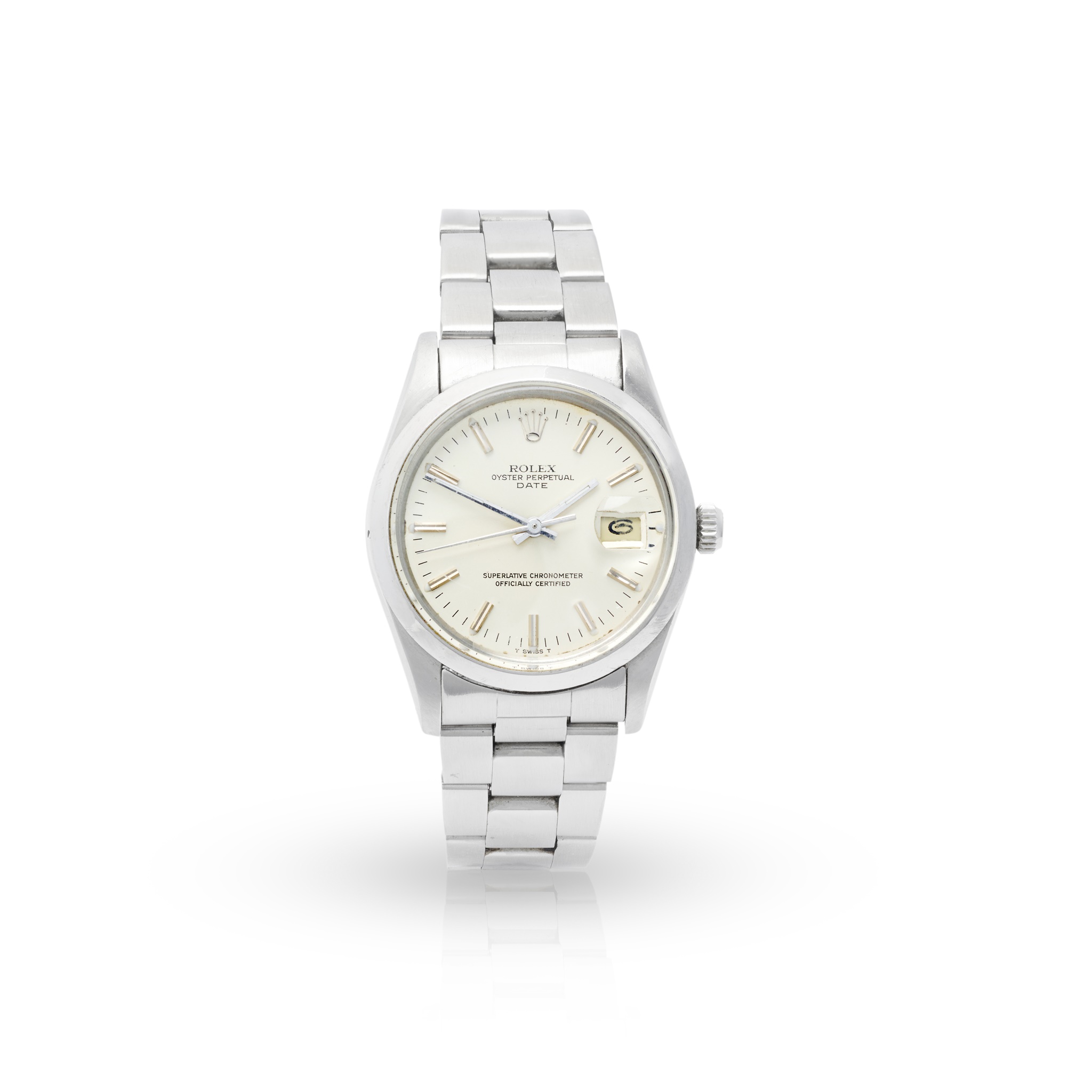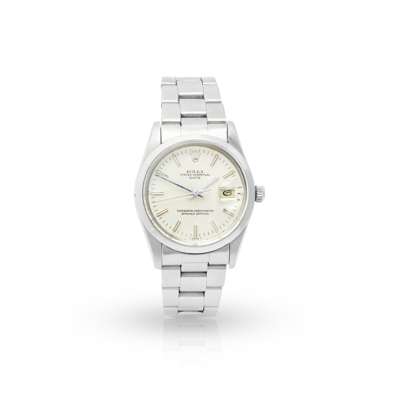 Oyster Perpetual Datejust model 15000, 1982 from serial number, stainless steel case, automatic movement, round silver-coloured dial with applied stainless steel and black baton hour markers, date aperture at 3, outer seconds track in black, stainless steel pencil hands with lume inserts, centre seconds hand, screw-down crown with coronet, on a stainless steel Oyster bracelet with 557 to the endlinks and 78350, 19 to the first links, no box and papers