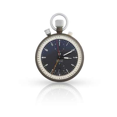 Olympic model, 1960s, coated metal case, manual wind, round black dial with Arabic numerals in white, sunken 30 minute register at 12, sunken small seconds at 6, raised outer running seconds track in white with Arabic numerals in black, central winder flanked by stop-start push button and screw-down hold button, in box, with carry case